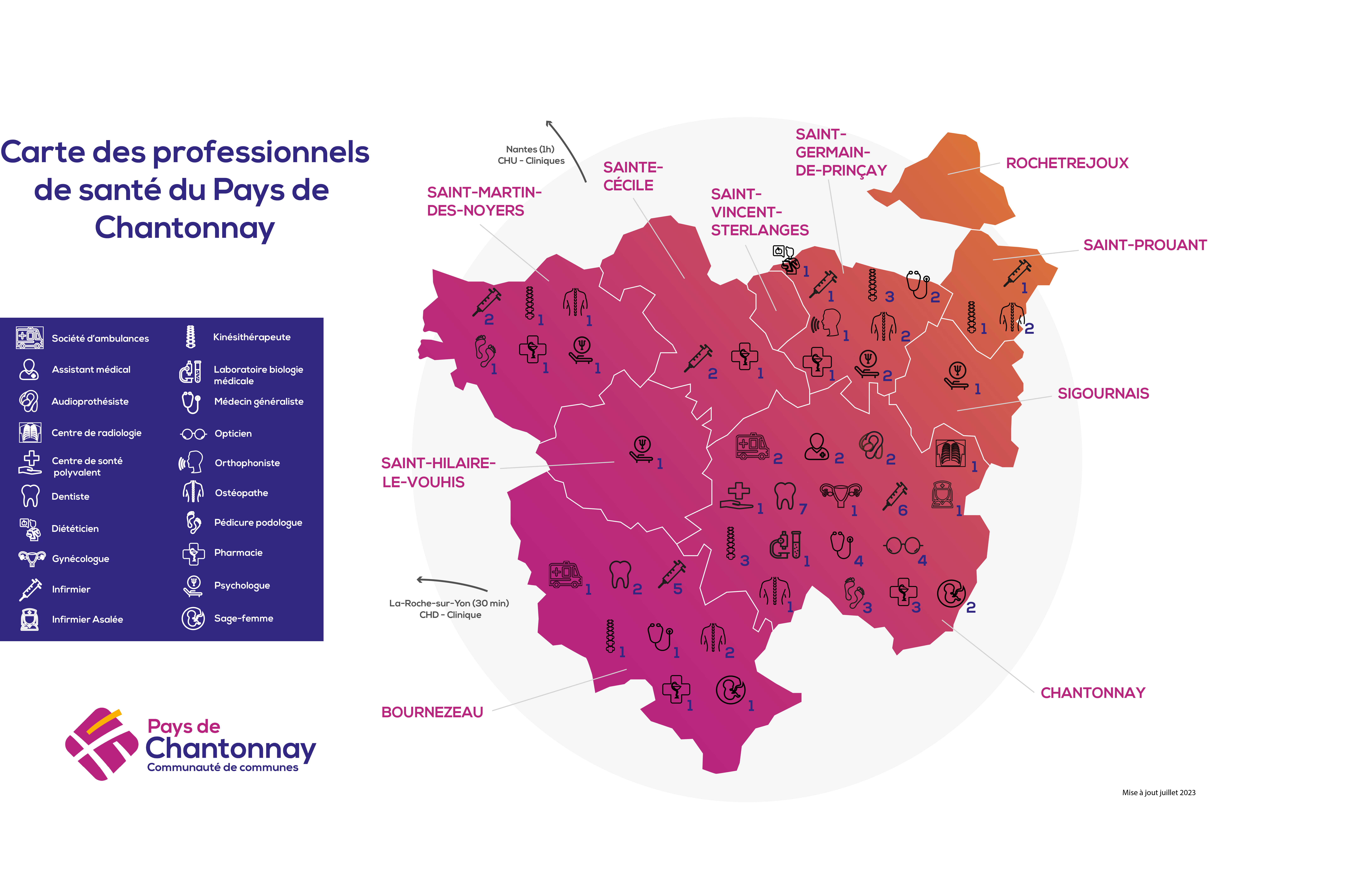 Le Pays de Chantonnay dispose d’un réseau de santé dynamique, comprenant diverses structures pluridisciplinaires et des cabinets spécialisés dans différents domaines de la santé. Nous vous soutenons à chaque étape de votre installation, tant sur le plan professionnel que personnel, en vous aidant à trouver un cabinet, un logement et en facilitant l’intégration de votre famille.